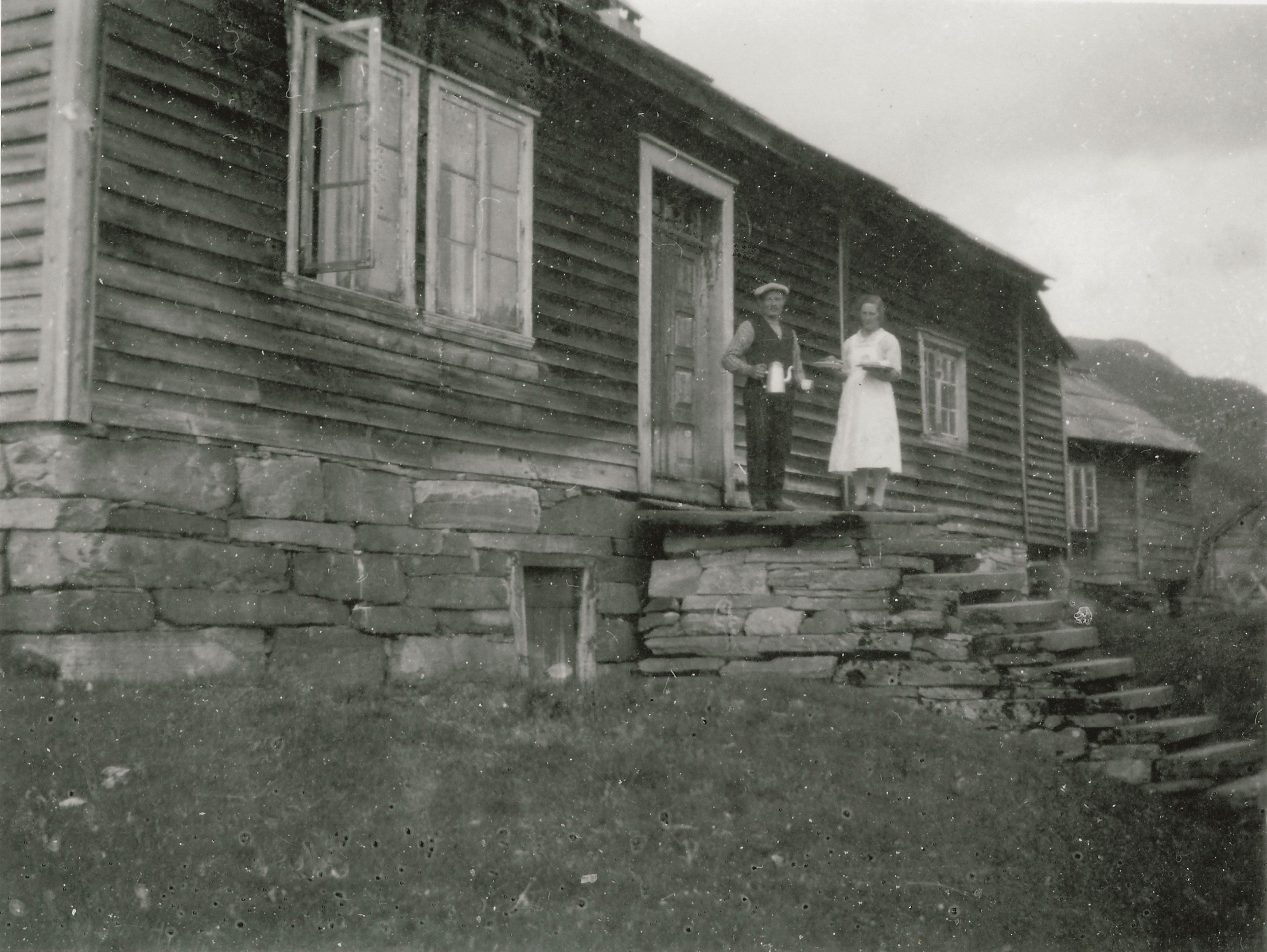 Huset på garden vart bygd for over 150 år sidan. Her står oldefar og ei tenestejente på trappa.
