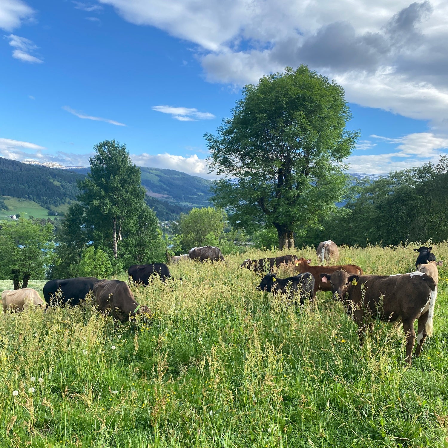 Me sel økologisk kjøt av grasfôra Vestlandsk fjordfe. Kjøtet kan du kjøpe i gardsbutikken vår, på REKO-ring på Voss og i Bergen og i utvalde